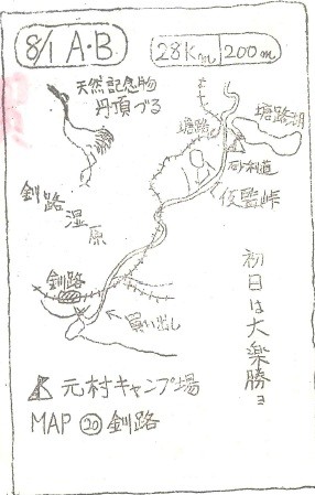 10時に集合、その後各自パッキングを済ませ、噴水の前で校歌の大合唱と、全体写真をとり、いざ出発、合宿の幕は切って落とされた。国道44号線をしばらく東進して左折。最初は舗装であつたが、地道に変わりゆるい登りとなる。そのうちに下りの舗装となり、塘路湖畔にある元村キャンプ場に到着。途中仮監峠とかいうのを越えたのであるが、全くもって正体不明であった。