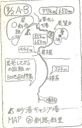 昼食を済ませ、屈斜路湖への長いダウンヒルを開始。ここで前を走っていた岸氏の重量弾丸走法を目の当たりにして私は驚愕した。彼はあたかも弾丸のように飛び、どんどんと小さくなってしまった。あっという間にダウンヒルが終わり、買い出しを済ませて屈斜路湖砂湯キャンプ場へ。湖丘を堀れば温泉が出るので有名なこのキヤンプ場に期待していたのだが、折悪く土、日にかかったため大変な混雑、他にテントを張る所が無く、ヤブの中に設営した。夜は夜で回りは宴会だらけ、うるさくて眠れなかった。