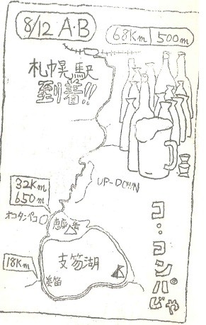 松森氏の出現によって士気が盛り上がり、合宿中最大の難所と思われるオロフレ峠目指して、皆一丸となって出発した。坂は予想以上に厳しく、おまけに交通量が多いので、峠に着いた時は皆自動車の巻き上げる砂ポコリで全身が真白に染まっていた。しかしながら霧が出てきて峠からの景色はまったく見えず、本当腹ん立つ峠であった。